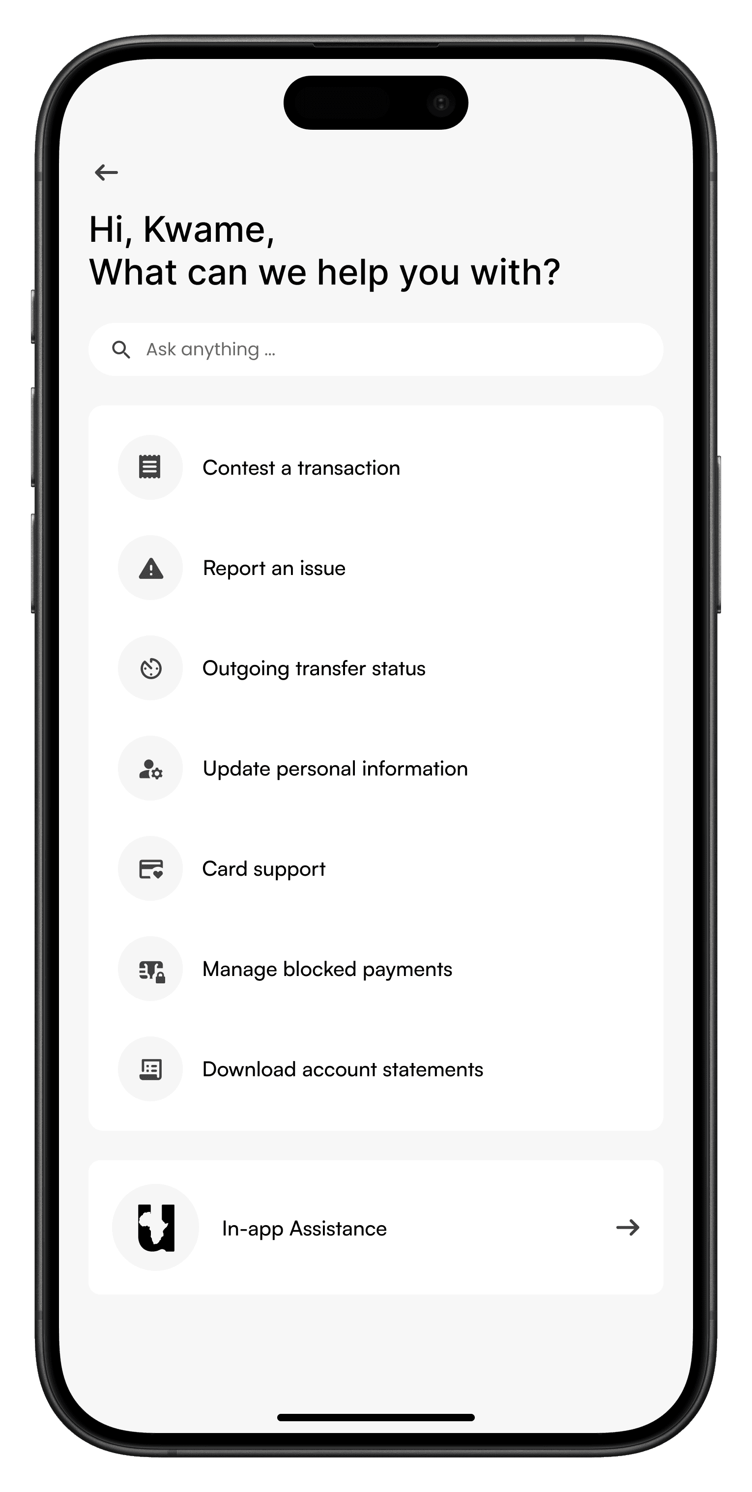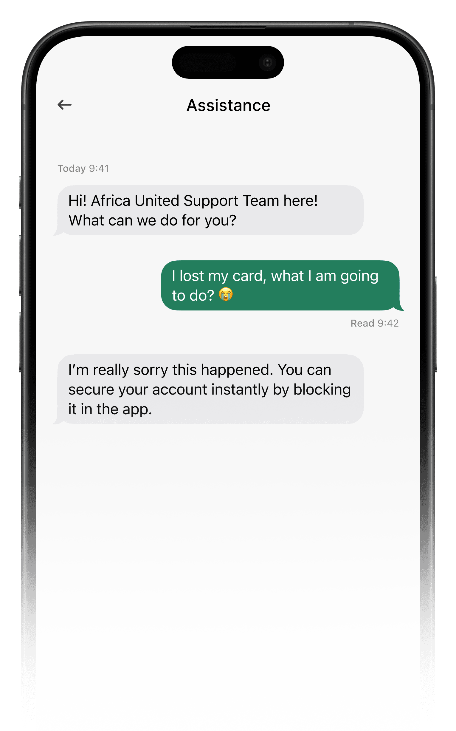 Reach us directly from the Africa United app for fast, secure, account-specific support, anytime you need it.